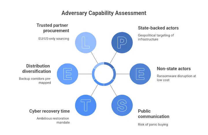 | Digital Paralysis | Coordinated ransomware disables warehouse and transport scheduling systems | 50–70% | 2–5 days of delivery disruption |